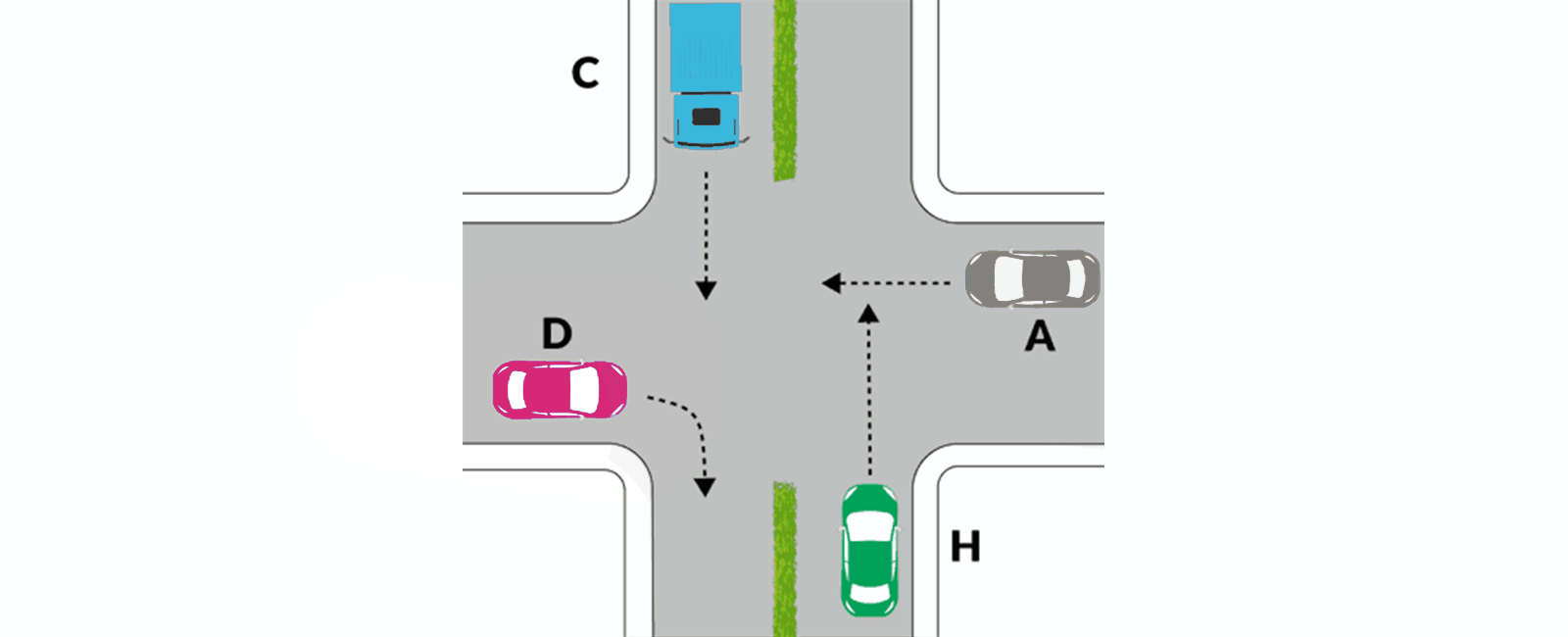 Nell'incrocio rappresentato in figura il veicolo A attraversa l'incrocio prima del veicolo C