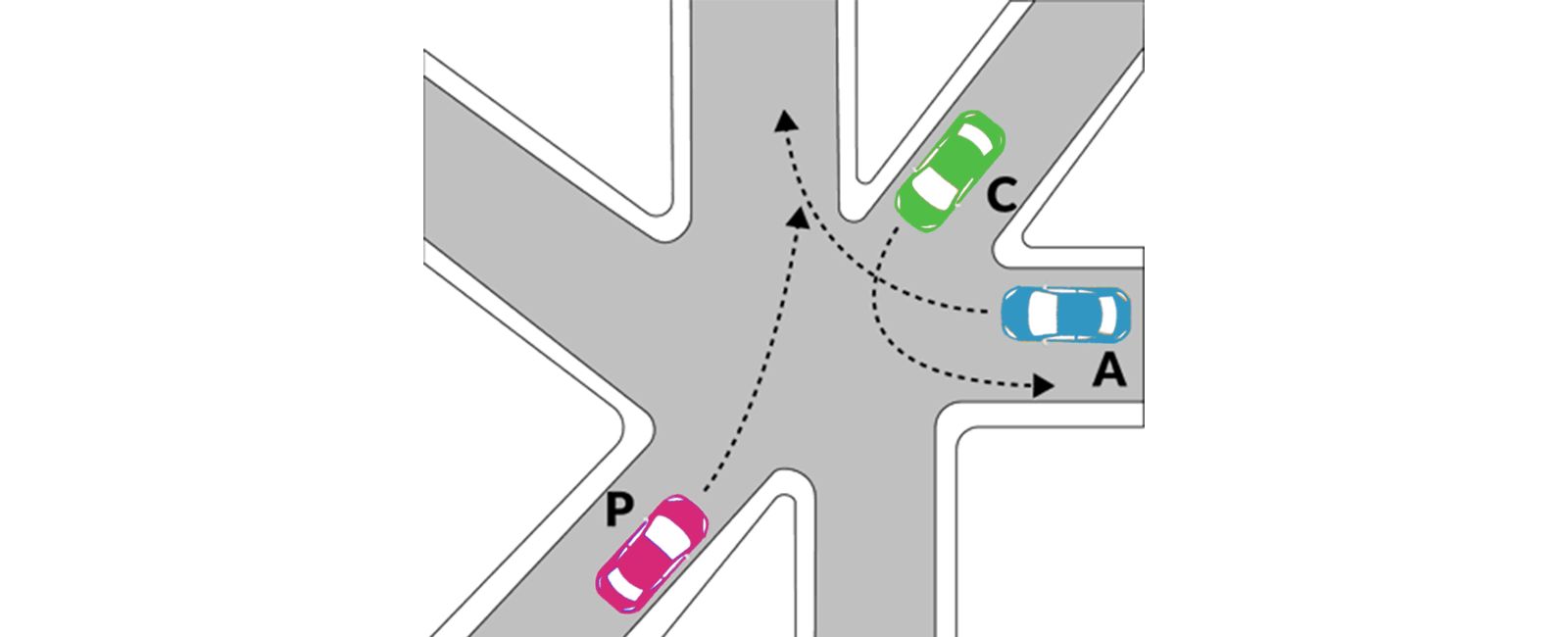 Nell'incrocio rappresentato in figura i veicoli passano nel seguente ordine: C, A, P
